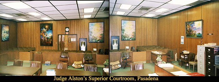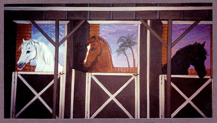 I took hunt seat/jumping lessons down the road at the Eaton Canyon Equestrian Center from trainer Roxanne Tallman and made a lot of new friends. Patricia Jones whom I rode trails with commissioned murals from me at her home. When she and her husband Sam invited me to a dinner held in honor of the Chief of Police of Pasadena I was seated next to Judge Gilbert Alston of the Pasadena Supreme Court. The judge and I got along great and he was so interested in my art that he invited me to exhibit several very large canvases in his courtroom! This was very exciting but when we transported them they did not fit inside the elevator so we had to put them on top of the ceiling of the elevator and precariously ride up to the second floor that way. They were displayed on the courtroom walls for all to see for the next 6 months.