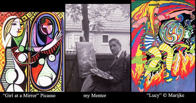 In his spare time he painted copies of old masters as well as my favorite, Picasso’s β€œGirl at a Mirror”, with oil paint and a real palette, which fascinated me no end because art was my passion and I had been drawing and coloring for as long as I could remember but I was not able to master the difficult medium yet when he let me try it out. This Picasso was my first psychedelic influence and I subconsciously based my gouache β€œLucy” on it, painted in 1966.