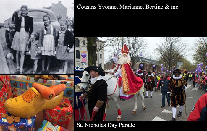 In the first grade I made my first β€œmural” in colored chalk on the blackboards around the class room about the story of St. Nicholas (aka Sinterklaas) who arrived from Spain on a large ship with an entourage of Moors to help him distribute presents to those children who had been good. St. Nicholas in his bishop’s tabard and miter rode his white horse over the rooftops and dropped the gifts down the chimney. Only if a carrot or apple for the horse was placed in the child’s shoe by the stove or fireplace, would they receive the first letter of their name made of chocolate! This event is celebrated on the 5th of December and the Spanish connection stems from the 80 year occupation of Philip II of Spain in order to repress Protestantism in the Low Countries in the 16th. Century.